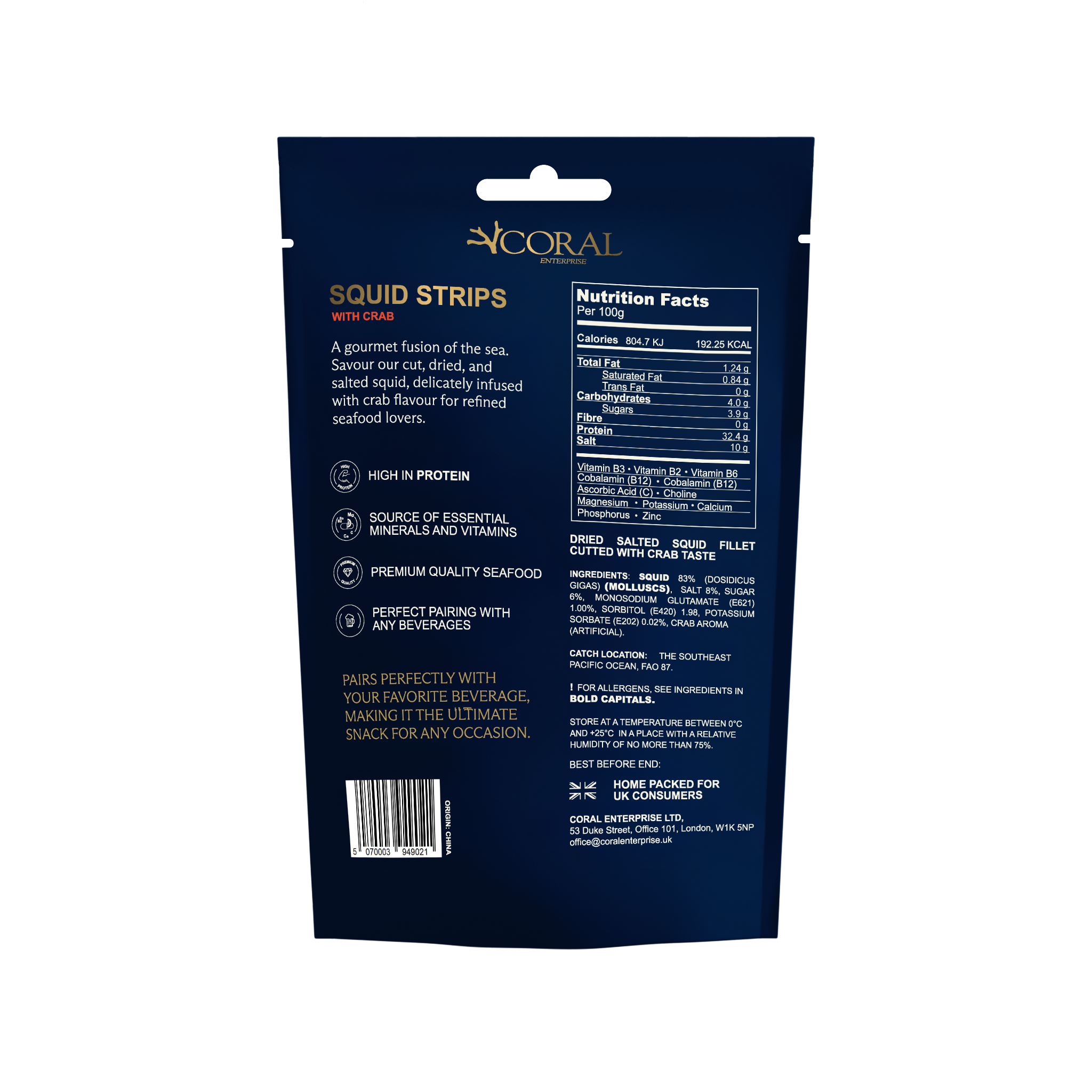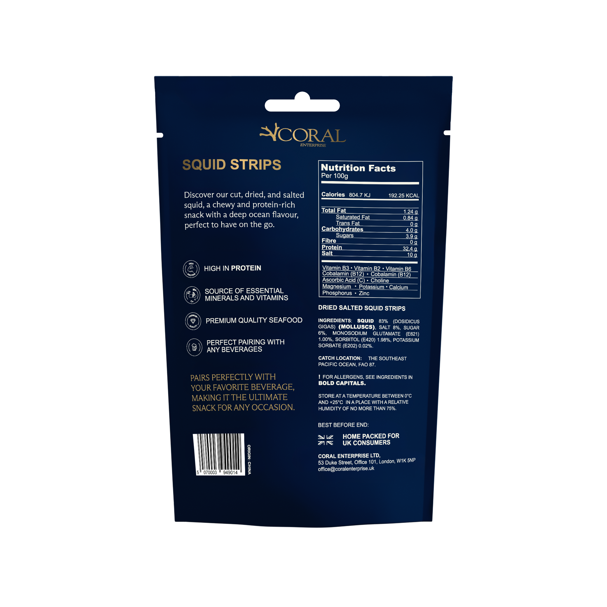 Our snacks lead the UK market in protein, with 32g in squid and 50g in fish per 100g.